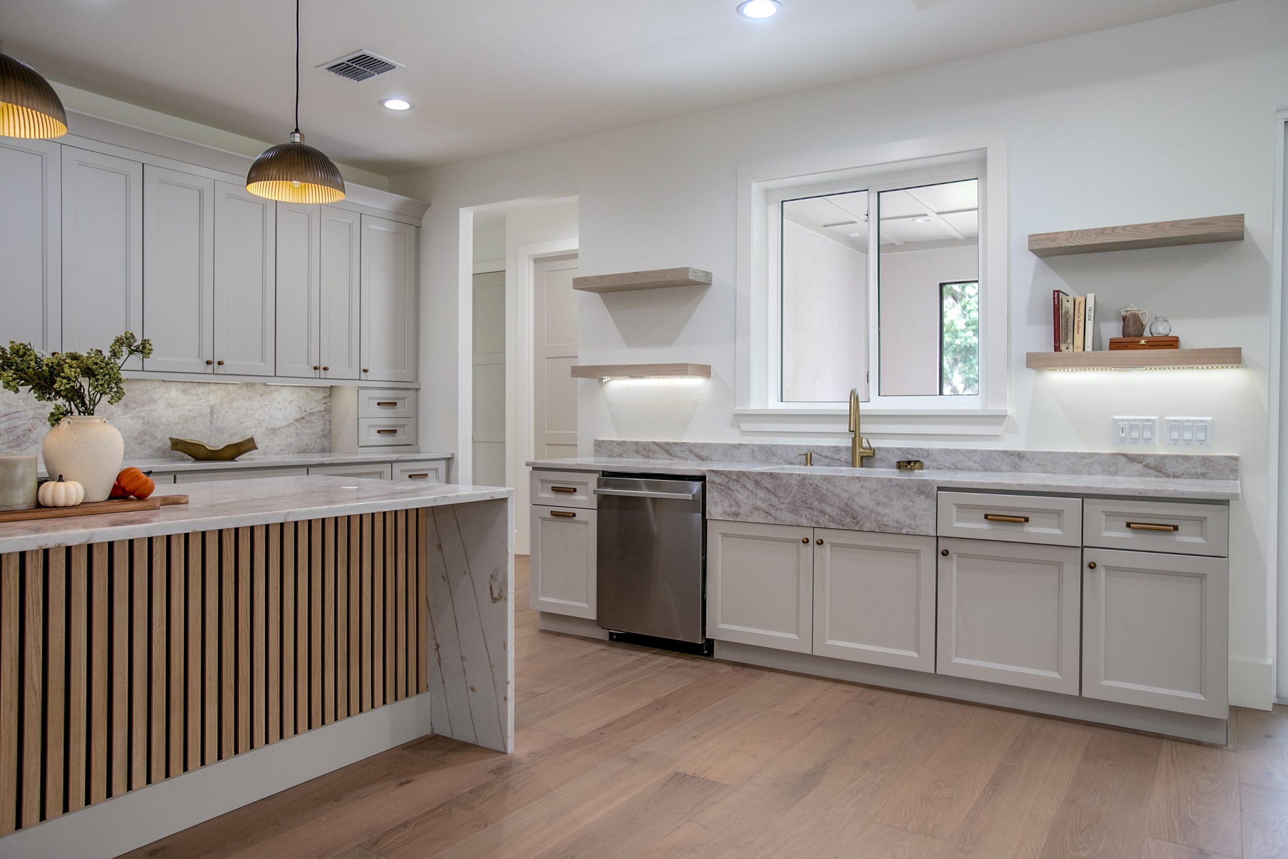 - Premium Cabinetry: All-wood construction, stainless steel appliances, and a custom apron-front quartz sink with a porcelain basin.