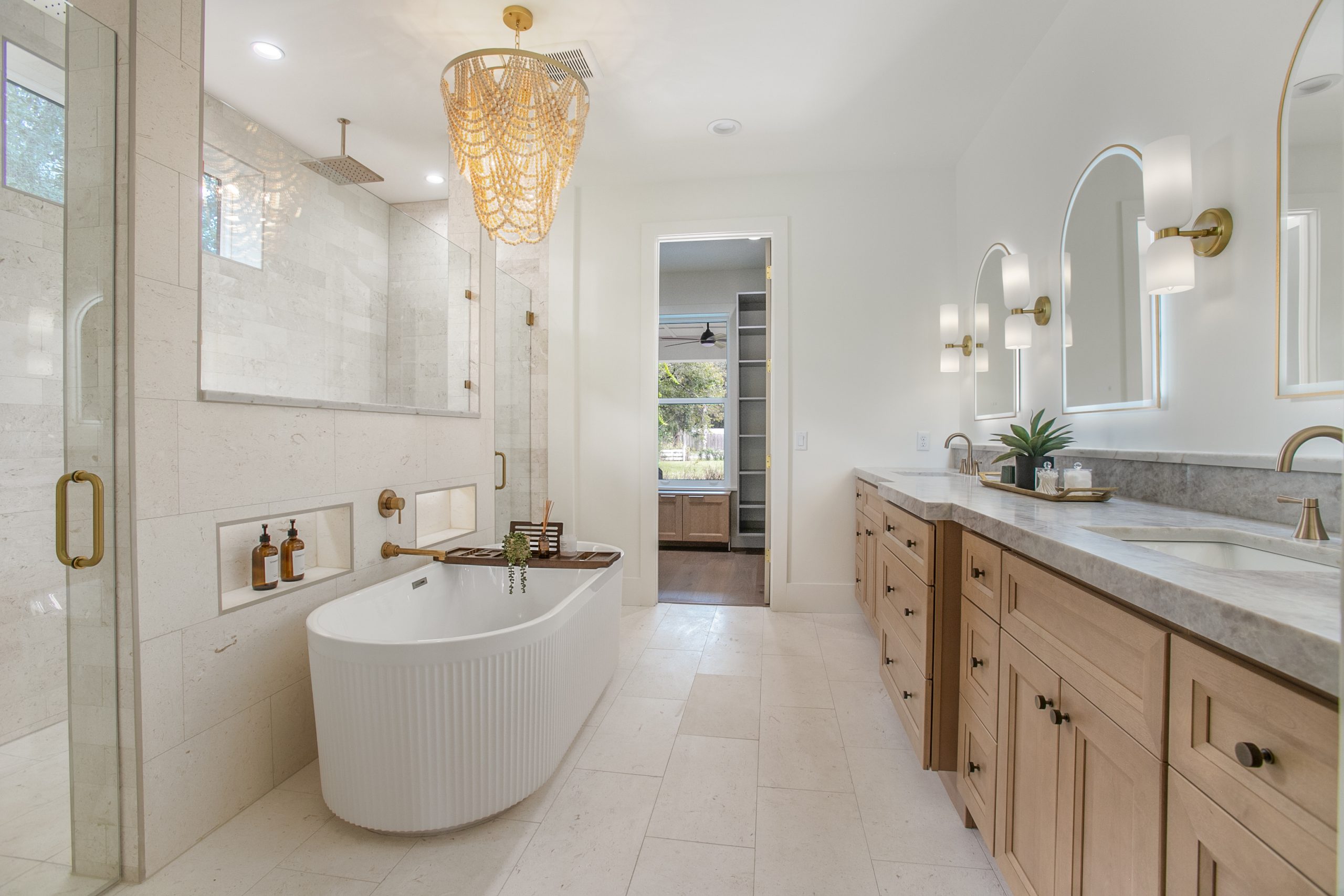 - The spa-like primary bath features elegant double vanities, a freestanding soaking tub, and a breathtaking walk-in shower with dual entries and rainfall showerheads.